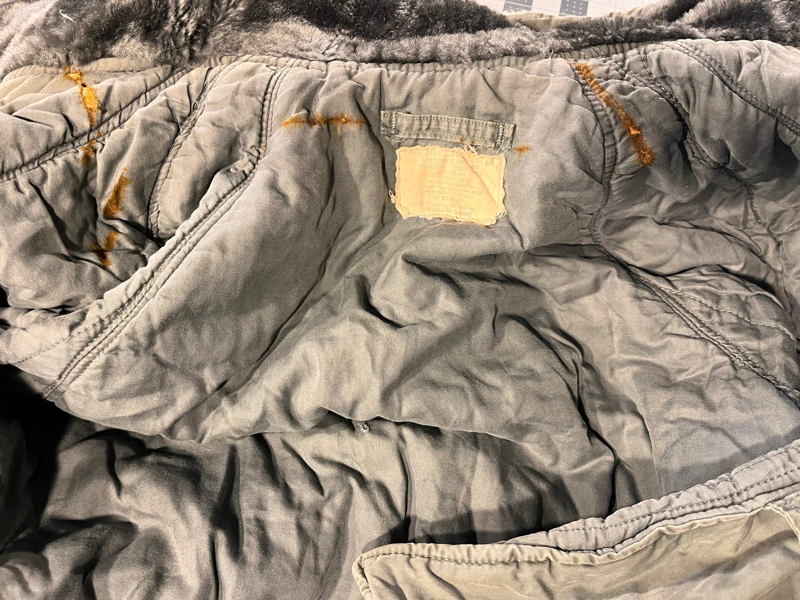 N-3B Parka size Medium with damage to the inside of the jacket. *You will get the exact jacket pictured so review condition carefully.