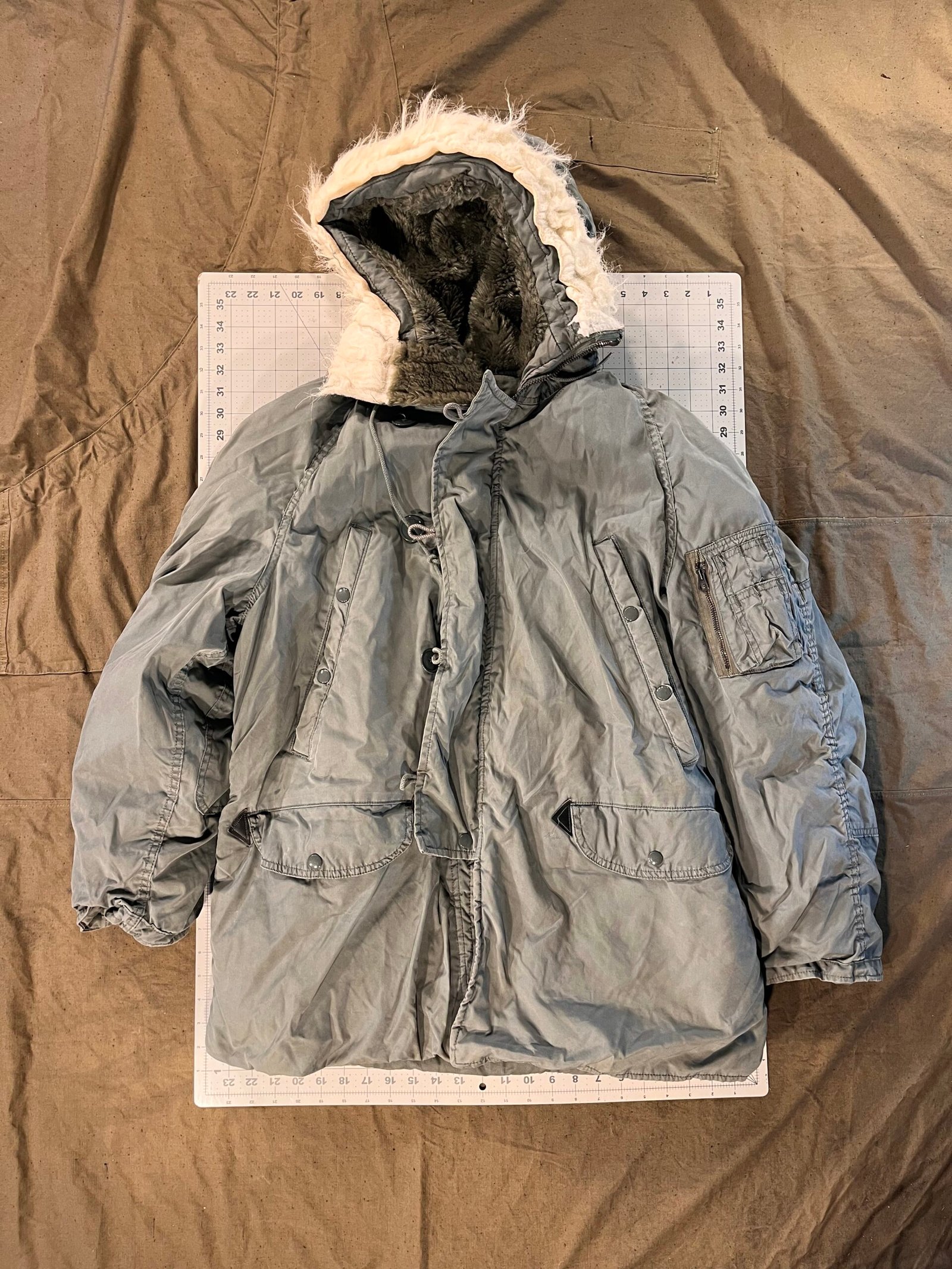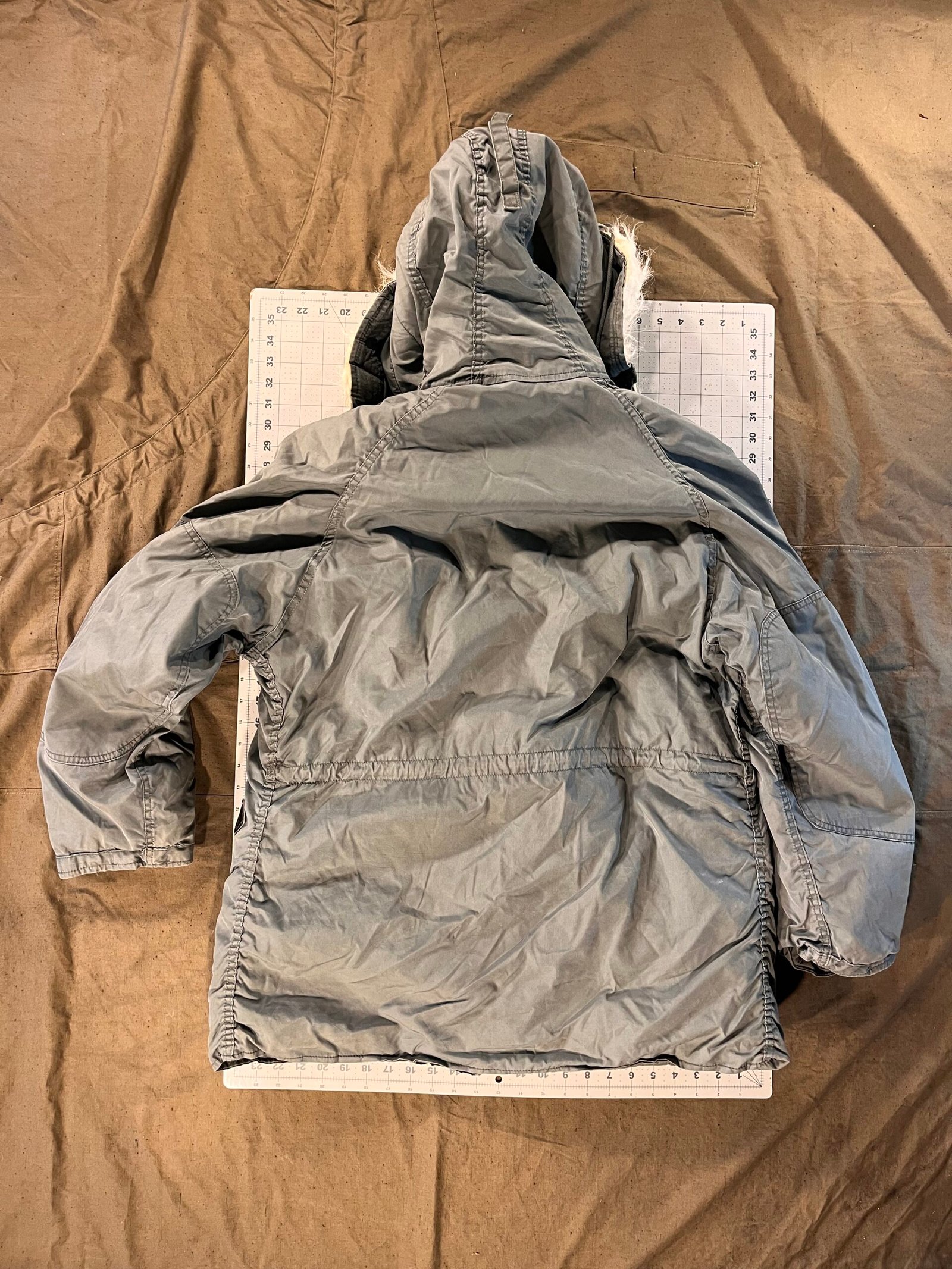An N-3B Parka size Small with a torn off label. Medium wear and unmarked.
